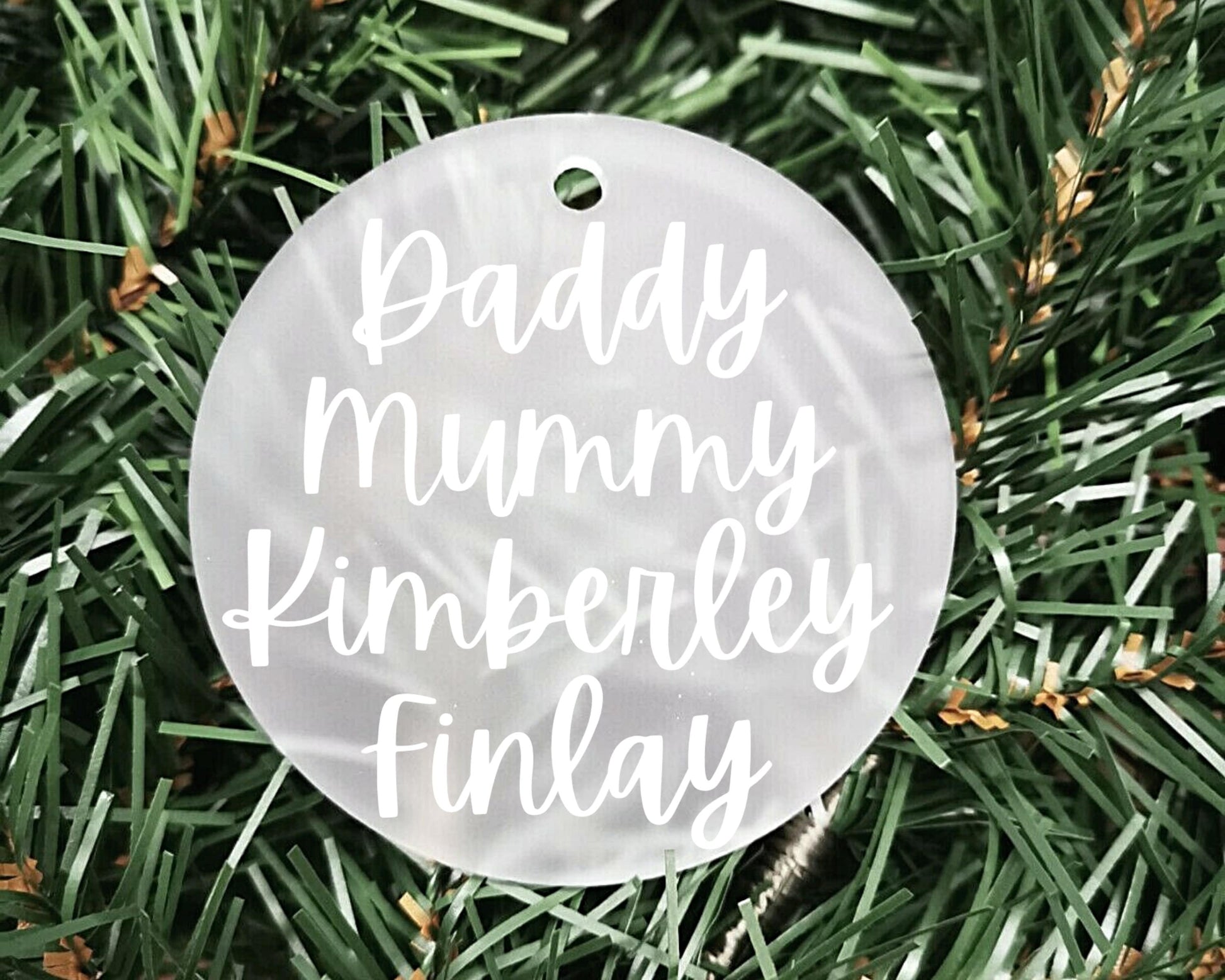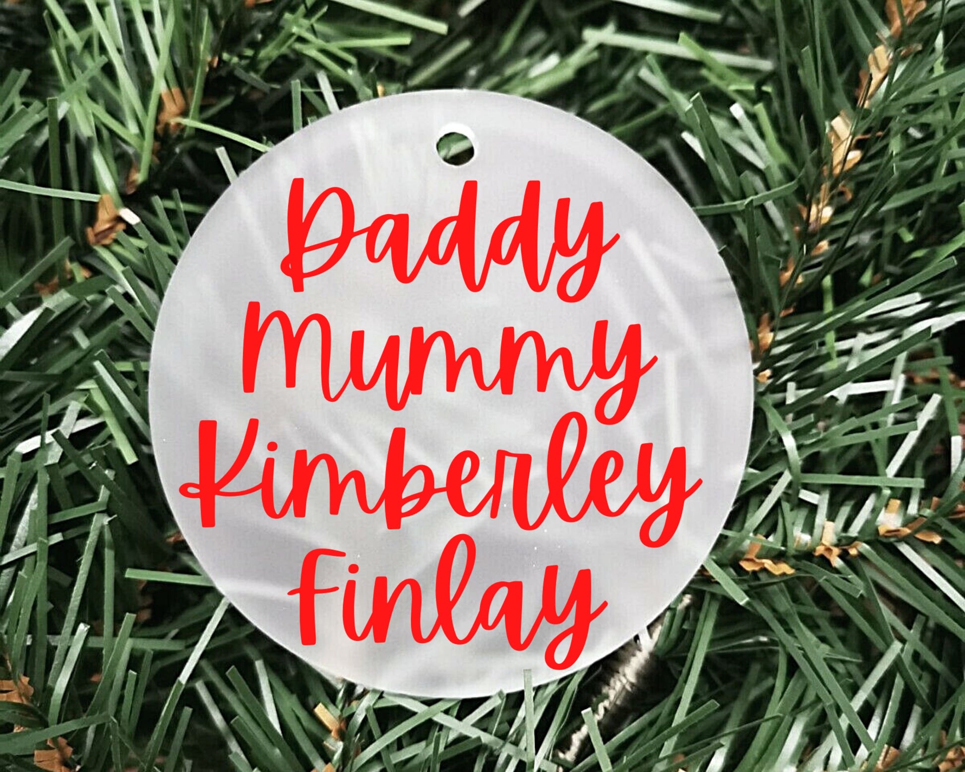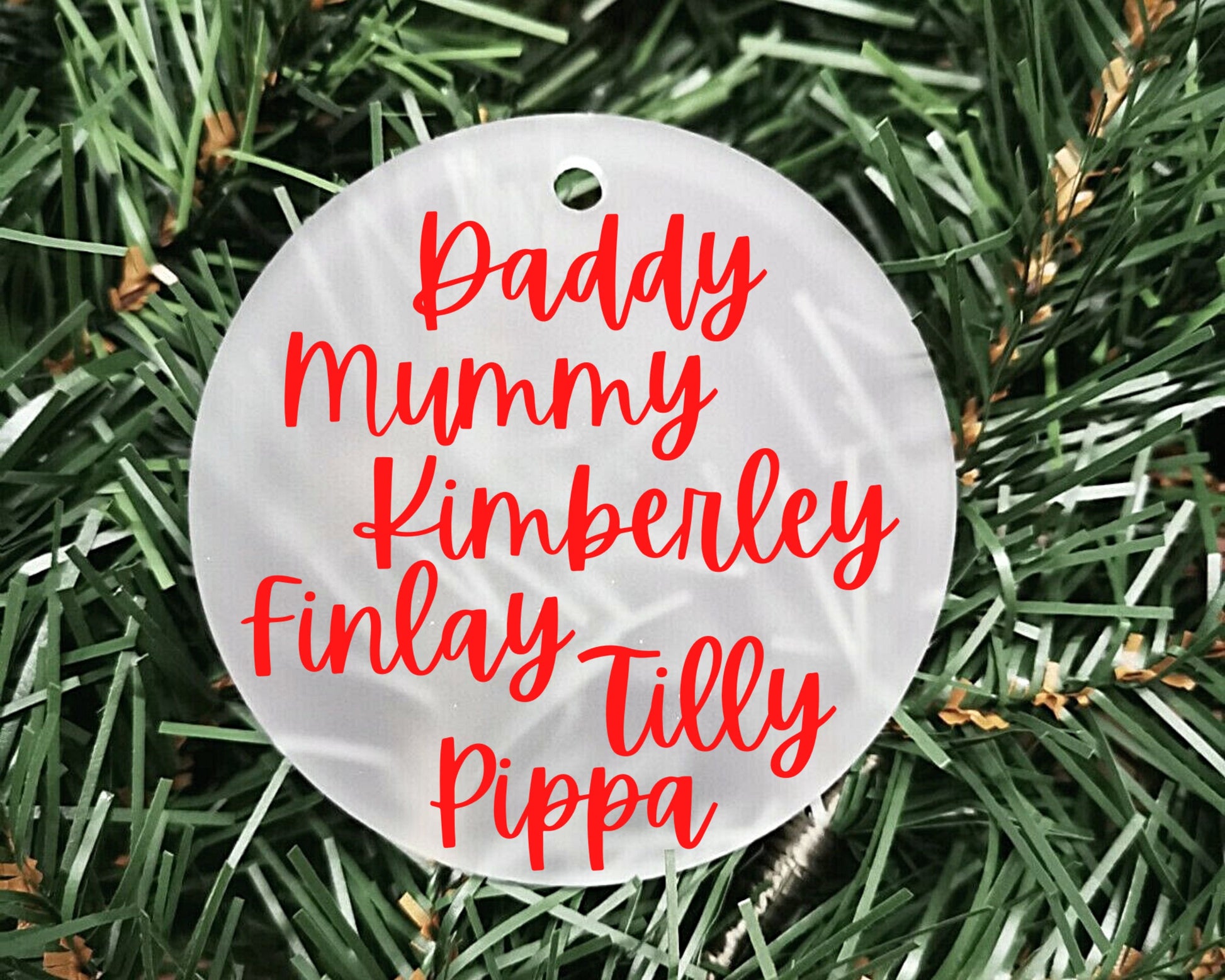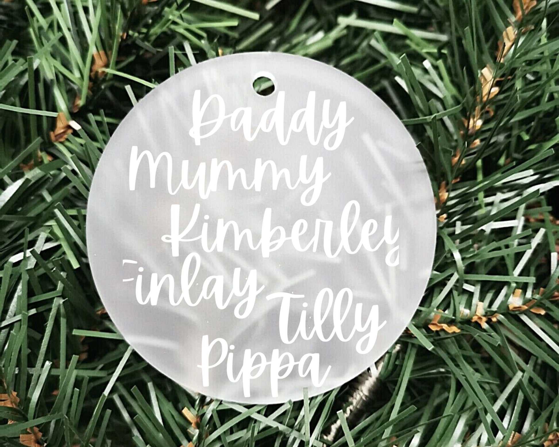 Family Names Christmas Bauble | Personalised Acrylic Bauble | Frosted Acrylic Hanging Decoration | Family Xmas bauble | Handmade Tree Decor