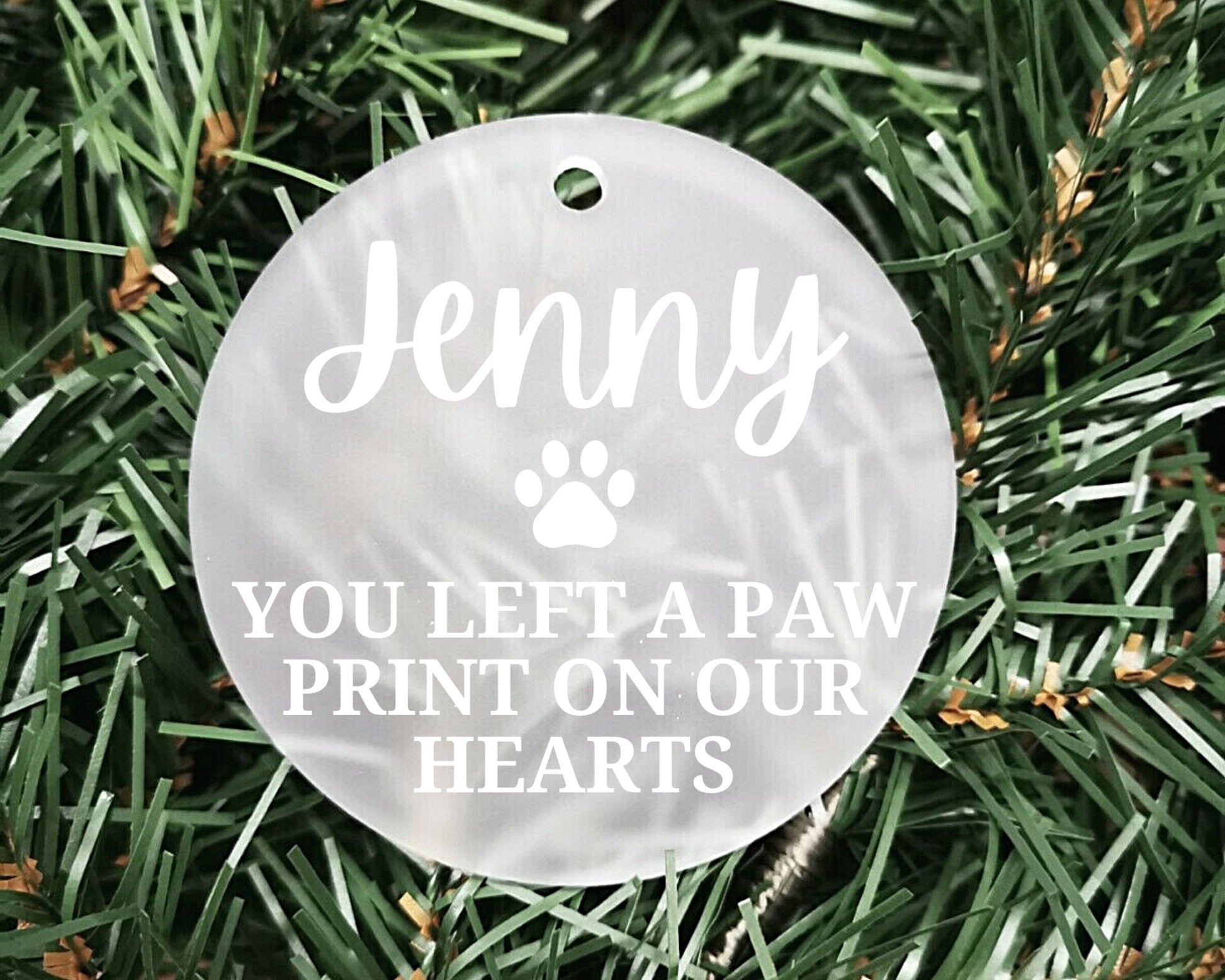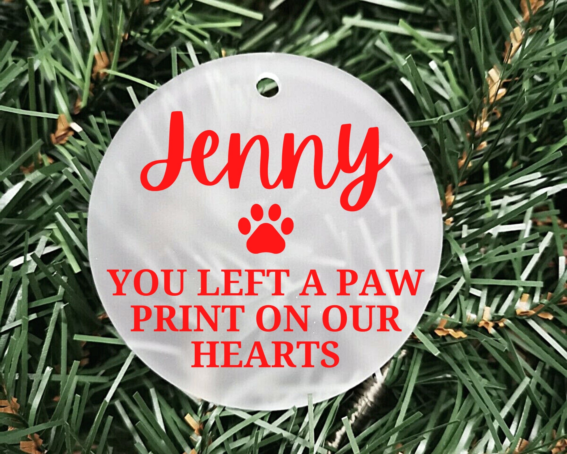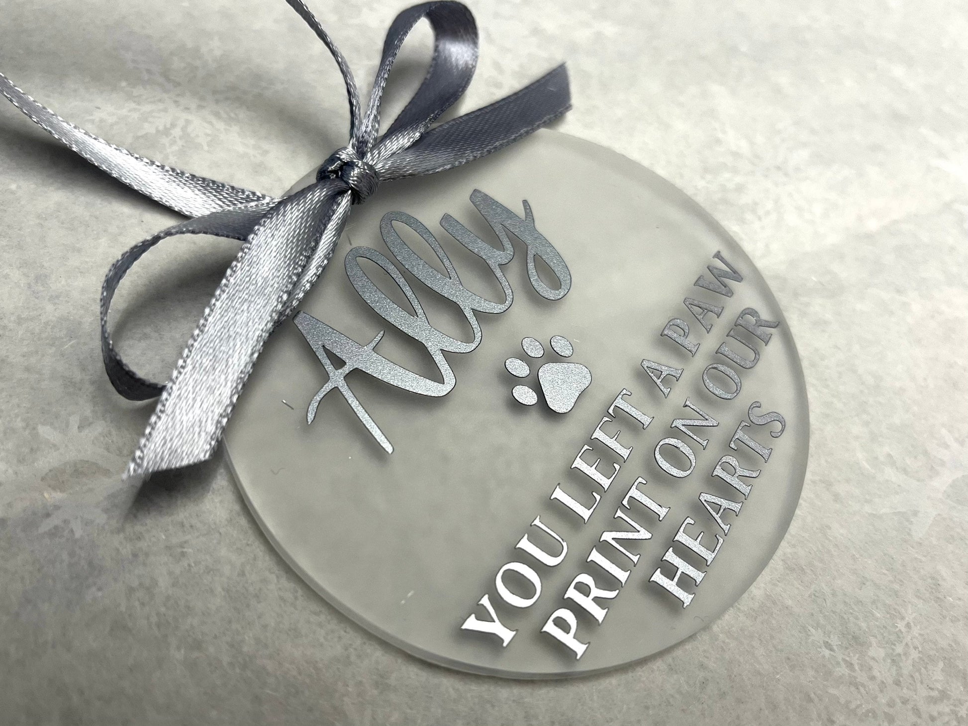 Left a paw print on our hearts | Personalised Acrylic Bauble | Frosted Acrylic Hanging Decoration | pet memorial bauble |Rememberance bauble