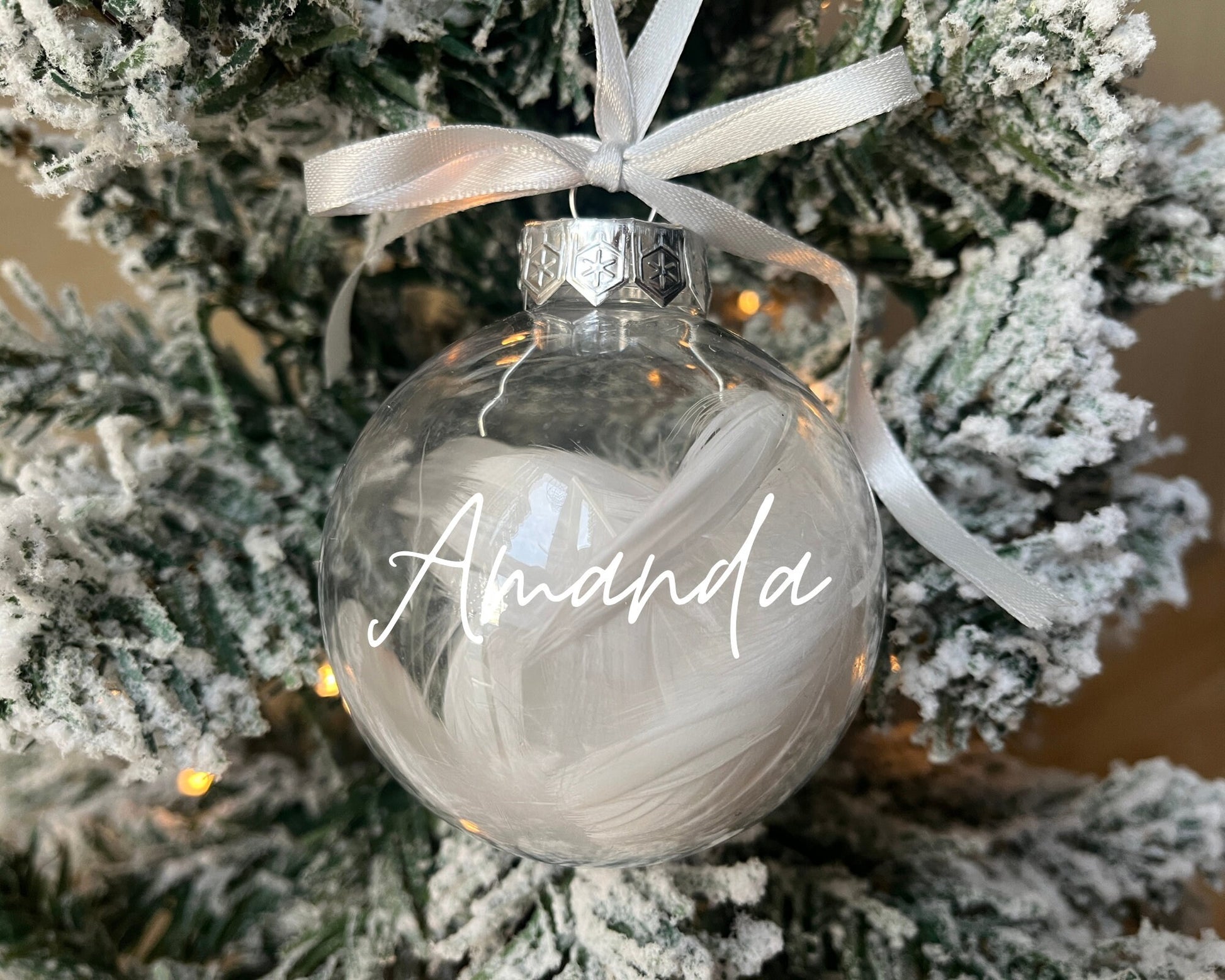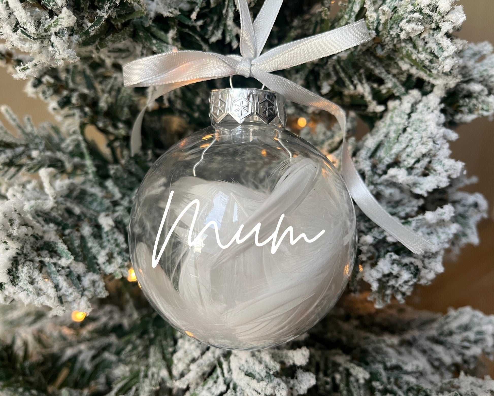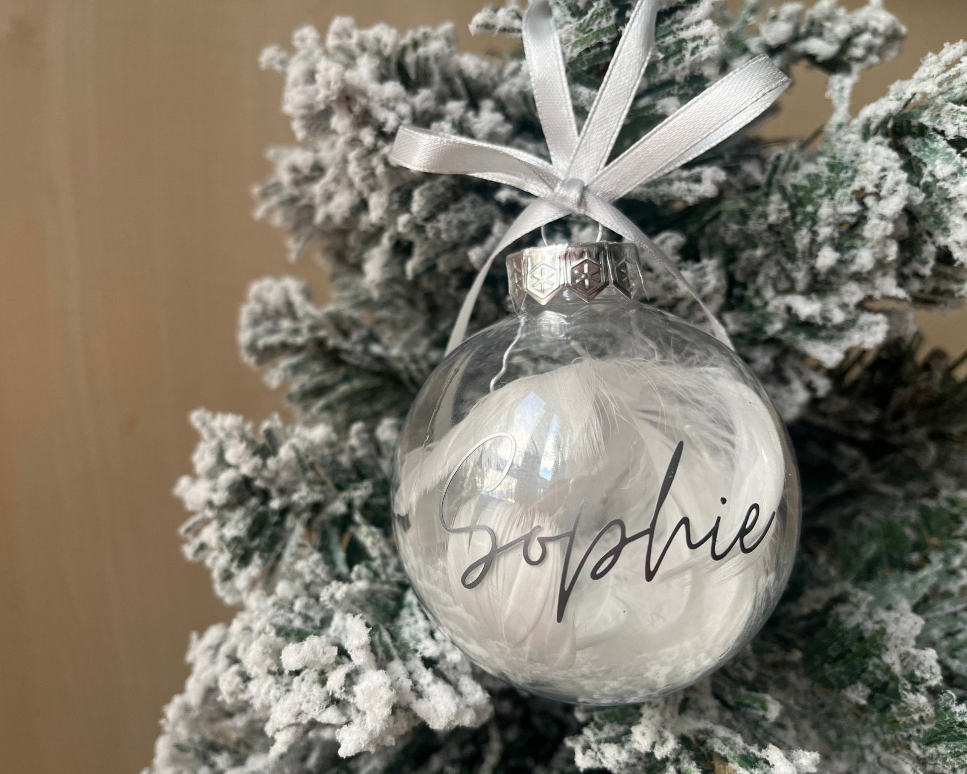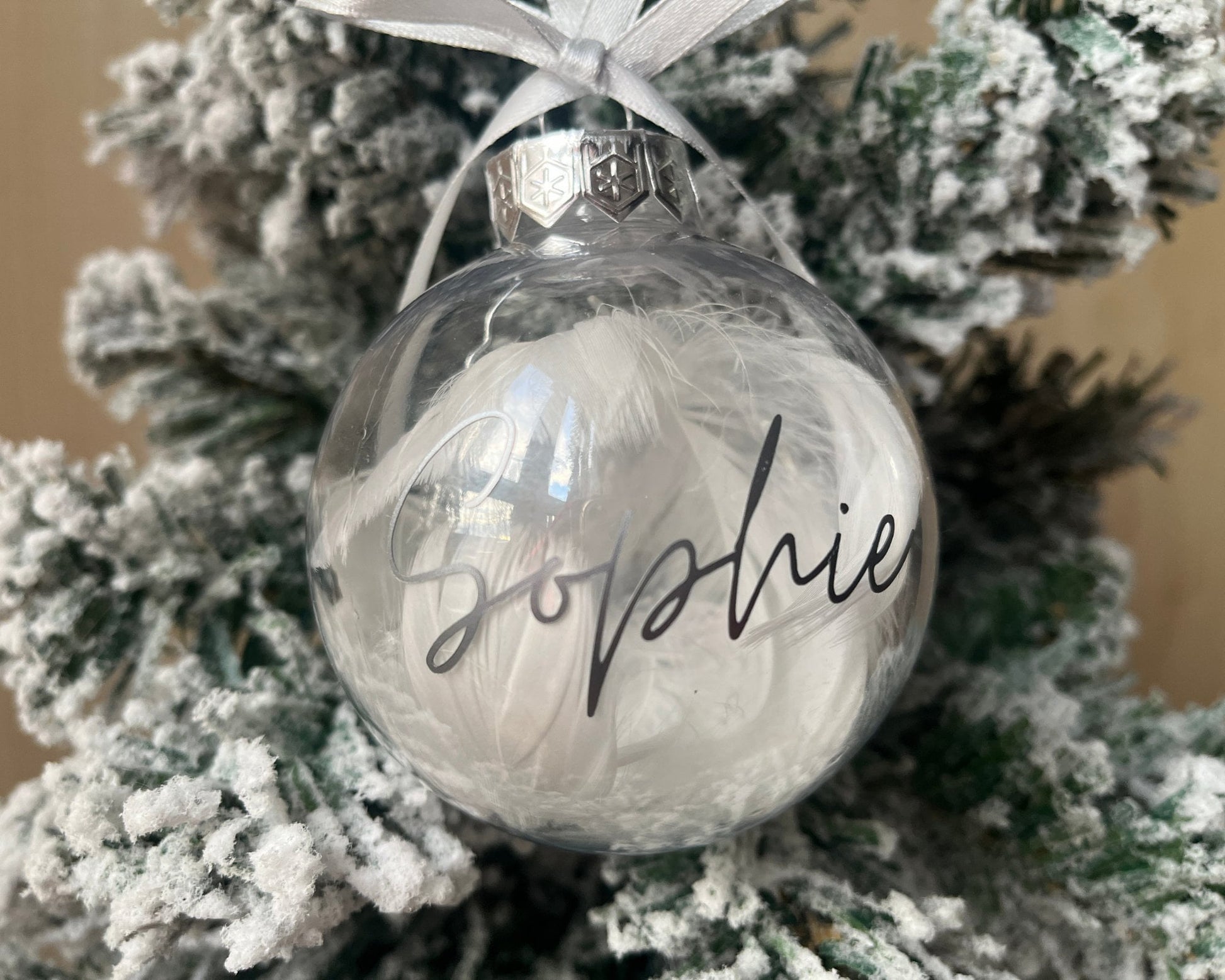 Personalised feather filled memorial bauble| Personalised Acrylic Bauble | feather filled bauble | memorial bauble | Rememberance bauble
