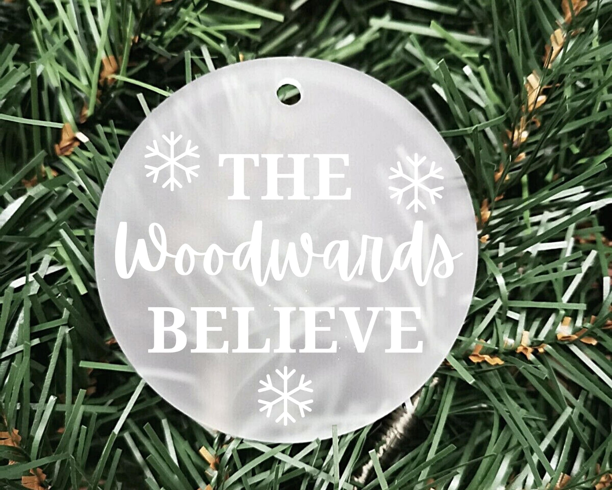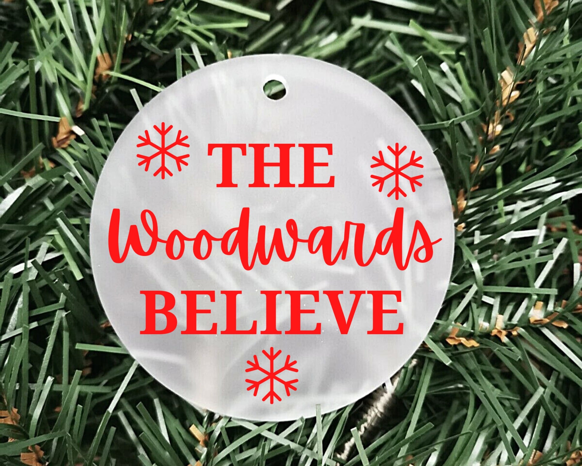 This family believes Surname bauble | Personalised Acrylic Bauble | Frosted Acrylic Hanging Decoration | Family Xmas bauble | Handmade Decor